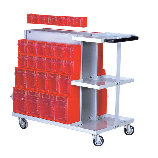 Carrello bifronte in metallo con un ripiani laterali porta attrezzi - Dim: 500x933x805 mm - Allestito con 60 cassetti basculanti: 2 WPF00101 - 4 WPF00102 - 2 WPF00103 - 2 WPF00104