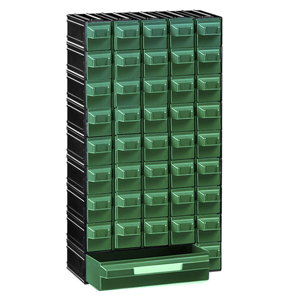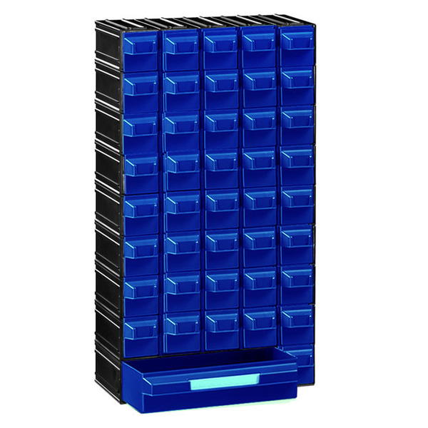 Cassettiera in plastica porta minuterie per magazzino componibile ad incastro di dimensioni 148 P x 292 L x 525 H mm, con 42 cassetti estraibili colorati