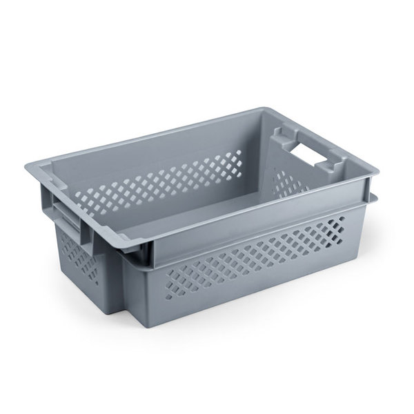 Contenitore in plastica inseribile e sovrapponibile di dimensioni Euro standard (misure standardizzate per l'utilizzo con Europallet) molto robusto e versatile che può essere usato anche per il contatto alimentare.
