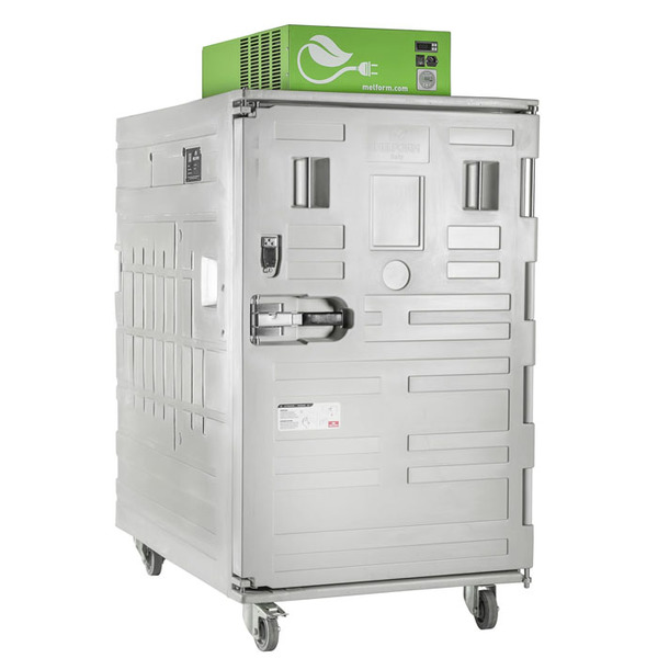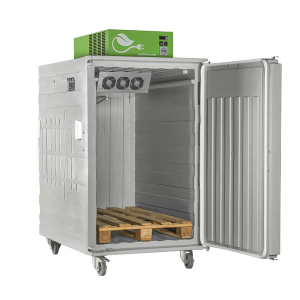 Contenitore isotermico Green (HDPE) per alimenti, refrigerato con motore, dim. 1405 L x 985 P x 1925 H mm, capacità 1115 litri con apertura frontale per trasporto di fresco omologabile ATP