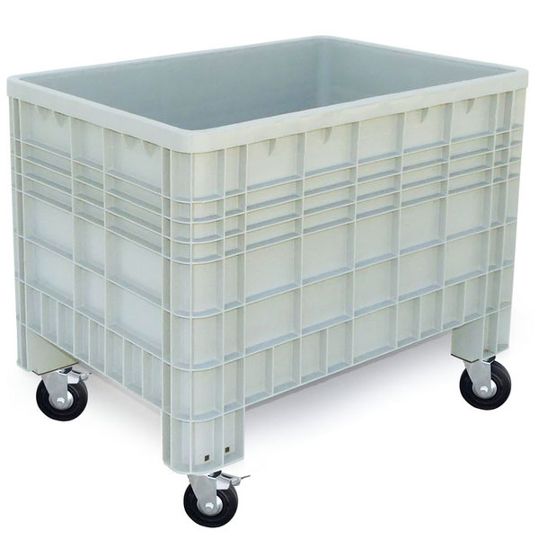 Cassa pallet in plastica con fondo e pareti chiuse dotato di quattro ruote girevoli in gomma