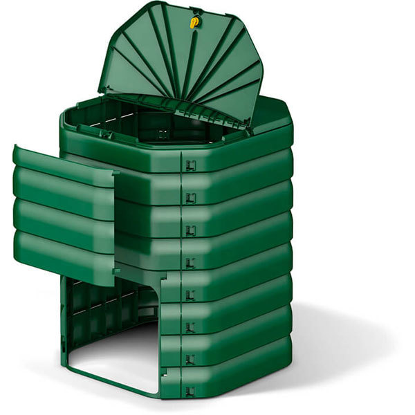 Composter 655x655x825 mm - 300 litri - Portello di scarico ad incastro su due dei quattro lati - Coperchio a due sezioni incernierate - Fondo aperto per intersacambio con terreno - Fusto composto da quattro settori ad incastro